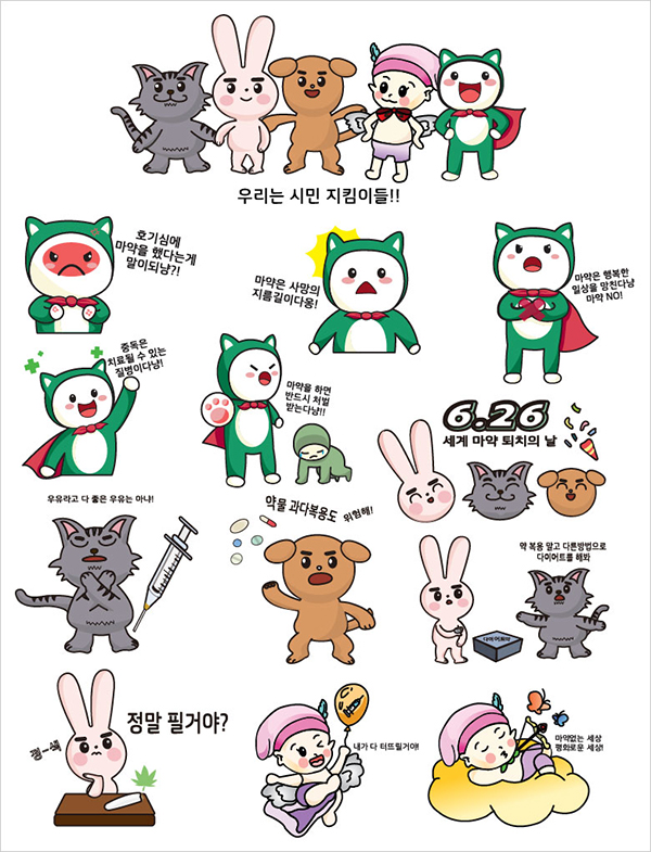 총 16종의 정지형 이모티콘을 작업하였고, 이모티콘 속에 불법 마약류 사용에 경각심을 가질 수 있도록 자연스럽게 녹아내었습니다. 또한, 경남마약퇴치운동본부의 사업이 널리 알려질 수 있도록 단체에 대한 정보를 드러내는 이모티콘 또한 포함되어 있습니다.