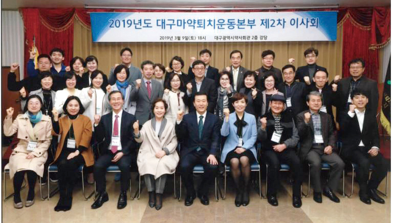 대구지부(지부장 이향이)는 지난 3월 9일(토) 18시 대구광역시약사회관 2층 강당에서 2019년 제2차 이사회를 개최하고 이향이 박사를 대구지부장에 선출하였다. 이향이 지부장은 취임사에서 “마약은 대학생, 주부, 직장인 등 누구나 가릴 것 없이 급속도로 확산되고 있다며 치료와 재활도 중요하지만 마약의 검은유혹을 미리 차단할 수 있는 아동·청소년을 위한 예방교육이 더 중요하며 마약퇴치운동에 최선을 다하겠다”고 밝혔다. 또한 대구지부를 위해 6년간 대구지부장을 역임하면서 헌신해주신 이재규 전 지부장에게 공로패를 전달했다. 이번 이사회는 새로 구성된 이사와 감사가 첫출발을 하는 매우 뜻깊은 자리로 활동적인 많은 이사들이 참석하여 큰 관심을 보여주었다. 주요 안건으로는 2019년 사업계획안과 예산안을 심의하여 새로운 출발을 위한 큰 사업계획의 틀을 세웠다. 한편 이사회에는 이경희 이사장을 비롯하여 대구시약사회장, 대구지방검찰청, 대구시 보건복지국, 약대 교수 등 많은 분들이 참석하여 축하하였다.