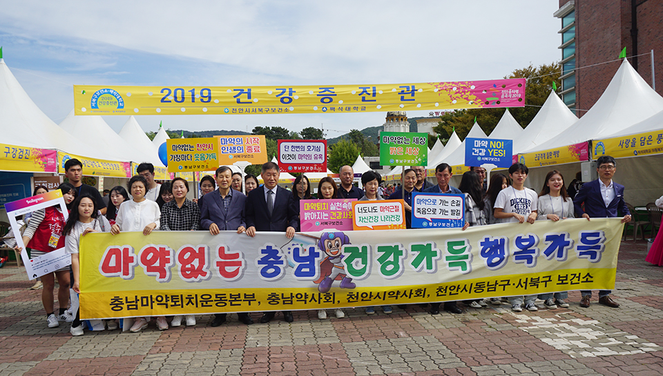 충남본부(본부장 박정래)는 지난 9월 26일(목) 오전11시, '2019천안흥타령춤축제 행사'와 연계하여, 천안삼거리공원주행사장 일원에서 충남본부와 충남약사회, 천안시(서북구_동남구)보건소 공무원 등과 함께 “불법마약류퇴치캠페인”을 실시했다. 현수막, 어깨띠, 피켓 등을 이용하고, 다양한 홍보물(부채, 볼펜, 물티슈, 마스크, 마약관련 홍보인쇄물) 등을 배포하며, 지역민과 관람객들을 대상으로 마약에 대한 경각심을 일깨워주는 캠페인을 실시했다. 이날, 캠페인에는 충남마약퇴치운동본부 부본부장 김병환(충남약사회 부회장)과 김선기 약사, 천안동남구보건소 황민자 소장과 박상구 의약팀장 및 공무원들과 백석대학교 학생, 사무국 직원 등 30여명이 참여하였다
